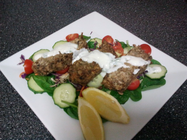 | Nutmeat Patties with Yoghurt and Mint Sauce - who would have thought I would have ever opened a can of something called nutmeat??!! - Yum!! |